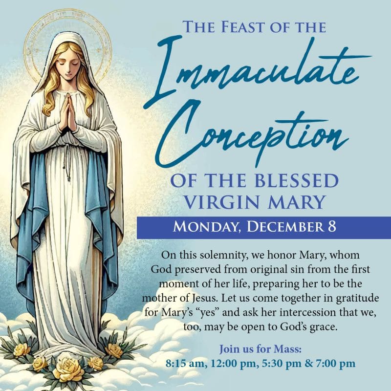On this solemnity, we honor Mary, whom God preserved from original sin from the first moment of her life, preparing her to be the mother of Jesus. Let us come together in gratitude for Mary’s “yes” and ask her intercession that we, too, may be open to God’s grace.