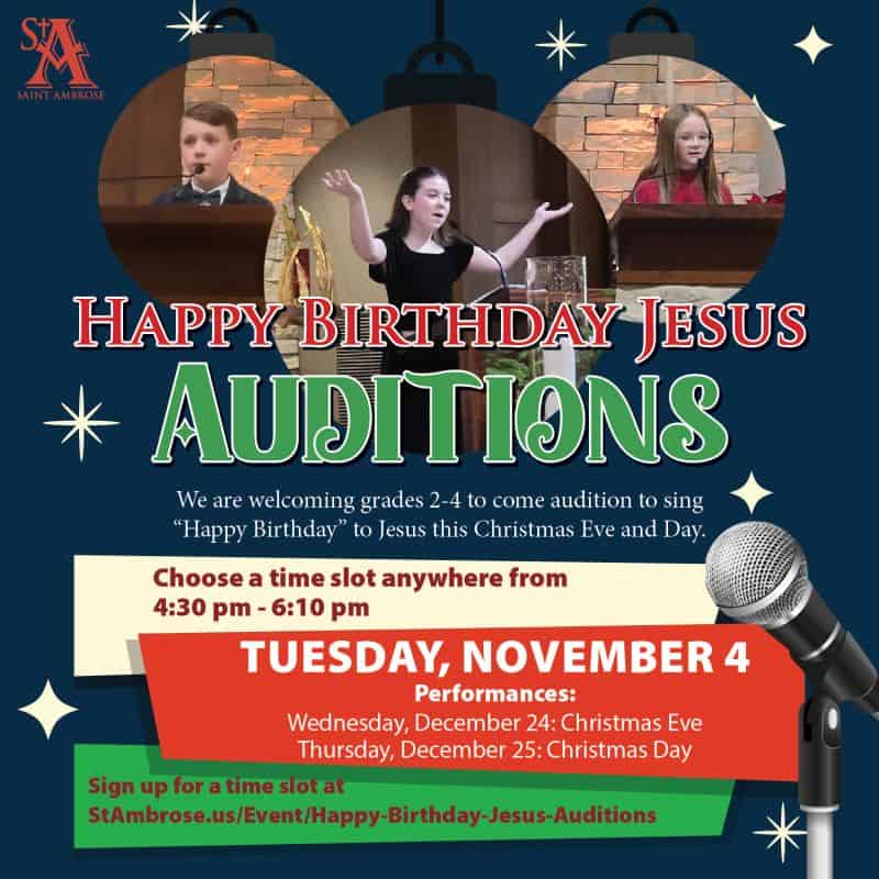 We are welcoming grades 2-4 to come audition to sing Happy Birthday to Jesus this Christmas Eve and Day! There are several Masses to choose from.