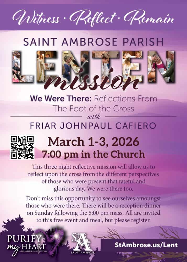 Friar Johnpaul Cafiero will lead us in our Lenten Mission Reflections from the Foot of the Cross: We Were There. This three night reflective mission will allow us to reflect upon the cross from the different perspectives of those who were present that fateful and glorious day. We were there too. Don’t miss this opportunity to see ourselves amoungst those who were there. March 1-3, 7-8:30 pm in the Church.