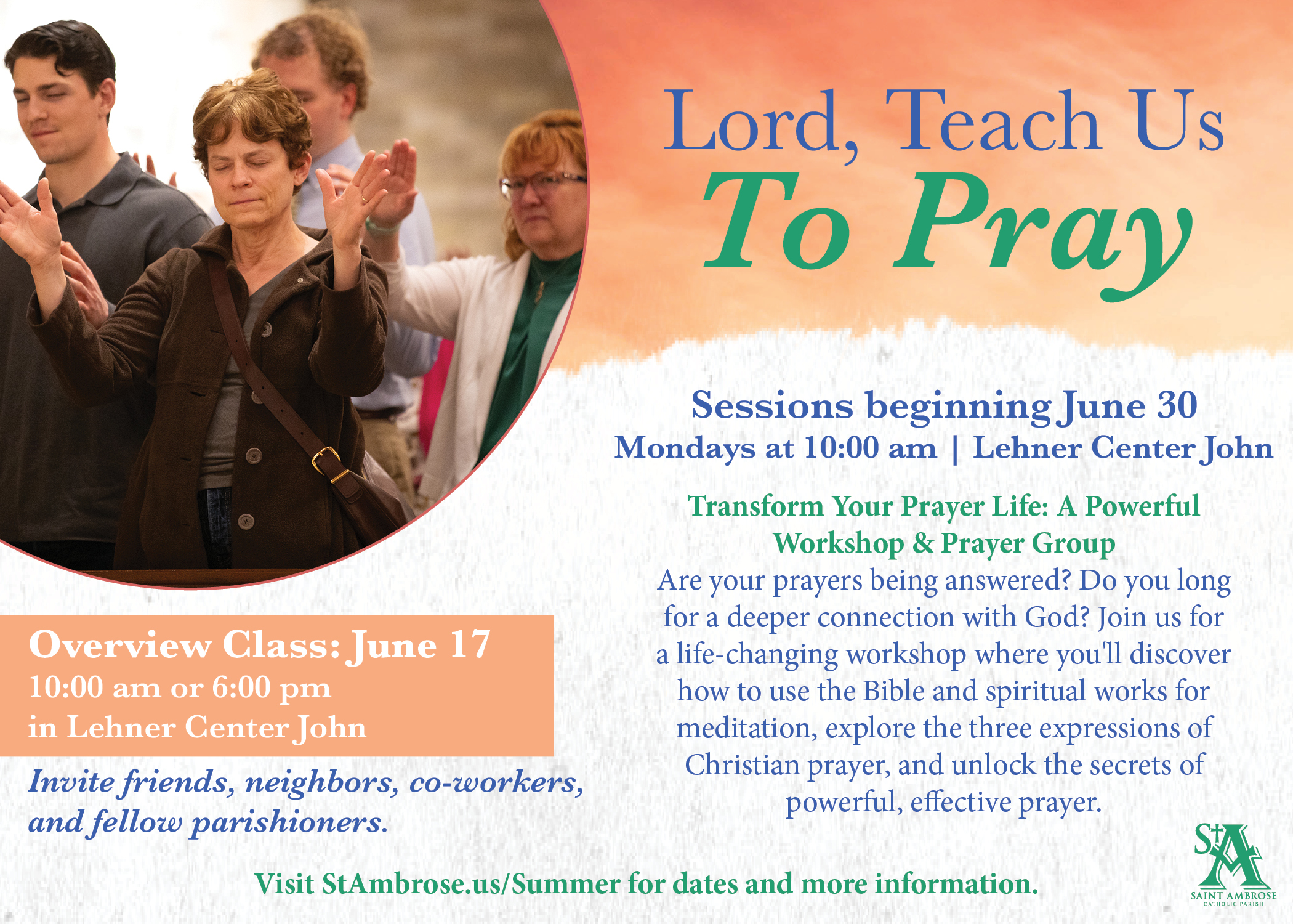 Are your prayers being answered? Do you long for a deeper connection with God? Join us for a life-changing workshop where you’ll discover how to use the Bible and spiritual works for meditation, explore the three expressions of Christian prayer, and unlock the secrets of powerful, effective prayer.