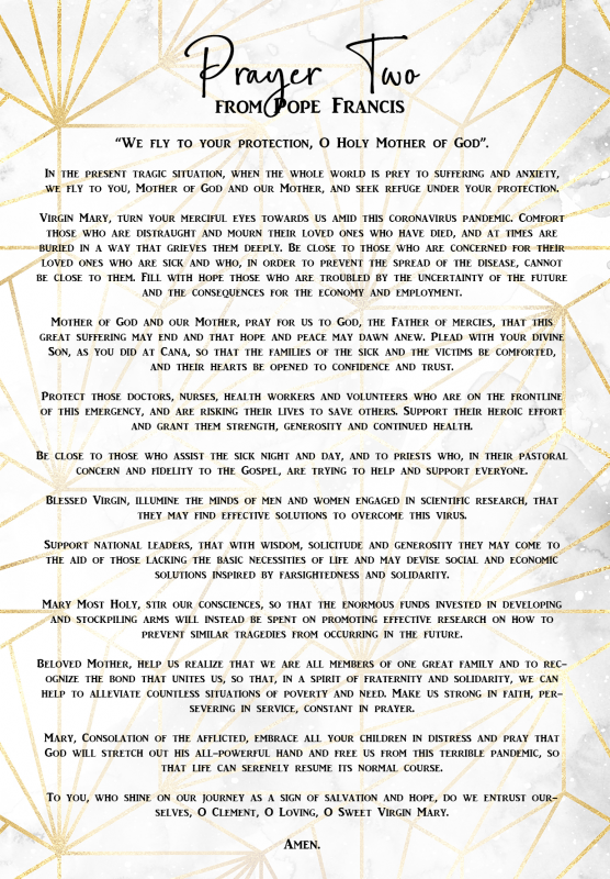 “Dear brothers and sisters, from this place that tells of Peter’s rock-solid faith, I would like this evening to entrust all of you to the Lord, through the intercession of Mary, Health of the People and Star of the stormy Sea. From this colonnade that embraces Rome and the whole world, may God’s blessing come down upon you as a consoling embrace. Lord, may you bless the world, give health to our bodies and comfort our hearts. You ask us not to be afraid. Yet our faith is weak and we are fearful. But you, Lord, will not leave us at the mercy of the storm. Tell us again: ‘Do not be afraid’ (Mt 28:5). And we, together with Peter, ‘cast all our anxieties onto you, for you care about us’ (cf. 1Pet 5:7).”