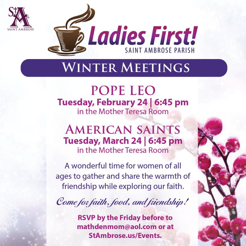 6 events,Children's Liturgy of the Word (CLOW) starts on September 6 and 7! We all know young children can have trouble sitting still during Mass. At CLOW, held during our 4:30 pm Saturday Mass and on Sunday at our 9:00 am and 10:30 am Masses, they can listen and ask questions while we discuss the readings [...] OCIA Breaking Open the Word Sessions Sundays - September 14 through April 12 | 10:30 am Mass until 11:30 am Candidates and Catechumen registered for the OCIA program will be meeting every Sunday at 10:30am mass in the main church. We will be dismissed from mass, after the homily, where we will then meet in [...] Children's Liturgy of the Word (CLOW) starts on September 6 and 7! We all know young children can have trouble sitting still during Mass. At CLOW, held during our 4:30 pm Saturday Mass and on Sunday at our 9:00 am and 10:30 am Masses, they can listen and ask questions while we discuss the readings [...] SUNDAY LENT BINGO Doors Open 2:00 pm | Bingo Begins 4:00 pm Bring a friend to play! Check out all of our BINGO food and game specials. Sunday, February 22 Buy an Early Bird package, get one FREE $4 Taco Salad & a FREE slice of cake Sunday, March 8 FREE Small Lightning with the [...] - Come and experience God's Supernatural Love with Encounter Ministry February 22, 2026 - FREE EVENT! 6:30pm Praise and Worship 7:00pm Father Paul O'Connor will share a Gospel Message 8:00pm Time of Healing Prayer We believe that not only does Jesus still heal today, but that healing is one of the most powerful ministries of evangelization. [...] | 6 events,Come Worship the Lord in Eucharistic Adoration. Adoration is held every Monday in the Chapel, from 9:00 am – 7:30 pm and is followed by Benediction at 7:30 pm to 8:00 pm. Questions? Reach out to Terri Parker at tmparker1122@gmail.com. Learn More & RSVP for Adoration! Faith & Fellowship Group: The Chosen 5 The CHOSEN 5: This 8-week TV series, The Chosen and interactive study guide, God’s Goodness for the Chosen, allows you to delve more deeply into each episode as you explore the life of Jesus. This Faith & Fellowship Group that meets the 2nd and 4th Mondays of each month, beginning October [...] Lent Small Group StudiesChoose one of three options this Lent and gather a group of friends to journey with you. Register your group and let us know how many books you need.Don’t have a group, no problem, join Gayle and Lisa as we journey through:Desert Bloom weekly on Mondays from 12:00-1:30 pm beginning February 23rd. (Held in Lehner Center, Father [...] Every week, we distribute 3,400+ peanut butter and jelly sandwiches to those in need... We are always looking for more help! Join us to pack lunches on Mondays through Thursdays, from 4:00 pm to 5:00 pm at Saint Ambrose Parish or make sandwiches at home and drop them off to Saint Ambrose! There are also many other ways [...] Book Club Beginning in September | 1:30 – 3:00 pm (Wednesday) or 6:30 pm - 8:00 pm (Mondays) | Fr. McGivney or LC Mark Book Club is a wonderful way to grow deeper in your faith. We will be reading 2 powerful books that could be game-changers for your life and understanding. Screwtape Letters by [...] The Daniel Plan NEW YORK TIMES BESTSELLER The Daniel Plan is far more than a diet plan. It is an appetizing approach to achieving a healthy lifestyle by optimizing the five key essentials of faith, food, fitness, focus, and friends. Unlike the thousands of other books on the market, this book is not about a [...] | 7 events,Centering Prayer Every Tuesday, beginning September 9th (except for holidays) | 4:00 - 5:30 pm | Pat's Home* (very near the church) *Address will be sent after registration* If you are searching for a prayerful time of silence with the Holy Spirit... If you desire to deepen your relationship with God... If you want to [...] Every week, we distribute 3,400+ peanut butter and jelly sandwiches to those in need... We are always looking for more help! Join us to pack lunches on Mondays through Thursdays, from 4:00 pm to 5:00 pm at Saint Ambrose Parish or make sandwiches at home and drop them off to Saint Ambrose! There are also many other ways [...] Healing Hearts Grief Ministry February 10 - March 17, 2026 Tuesdays, 6:00 pm – 7:30 pm in Lehner Center Children may have a difficult time to process emotions and feelings surrounding the loss of a loved one. It can be tough for them to talk about these feelings or know what to do with them. [...] "20 Minute Challenge" of Praying the Rosary Join us for the "20 Minute Challenge" of praying the Rosary Tuesday's & Thursday's during Lent at 6:00 PM in the St. Ambrose Chapel. This Lenten program will conclude with the Sorrowful Mother Rosary on Tuesday, March 31st. https://stambrose.us/wp-content/uploads/2026/01/SA26-LOM-20-Minute-Challenge.jpg https://stambrose.us/wp-content/uploads/2026/01/SA26-Ladies-First-WInter-Meetings.jpg DivorceCare New series beginning February 3 | Tuesdays | 7:00 pm – 9:00 pm | Lehner Center Luke Room Are you facing the struggles of divorce or separation? Loneliness? Anger? Betrayal? Depression? Financial cutbacks necessitating huge life changes? Helping kids adjust? You are not alone. There is help, hope, and healing in Christ. Saint Ambrose [...] Faith, fellowship, and basketball… All men are welcome; including all skill levels. We play every Tuesday and Thursday night from 9:00 pm – 11:00 pm in Hilkert Gym. We may take a few weeks off during the summer months depending on everyone's schedules. Contact Joseph LaGuardia, 484.269.6595 or starsbball146@gmail.com for more details. | 11 events, - Come join us on our annual casino bus trip! - WAITLIST ONLY This year we will be heading to Seneca Allegheny Casino. Cost is $55 per person and includes breakfast on the bus, round trip bus transportation, $35 in free slot play at the casino and $10 dining credit at the casino. Deadline to register [...] Route 66: Chair Strength & Stretch Wednesdays | 9:00 am - 10:00 am *Mother Teresa Room EXCEP