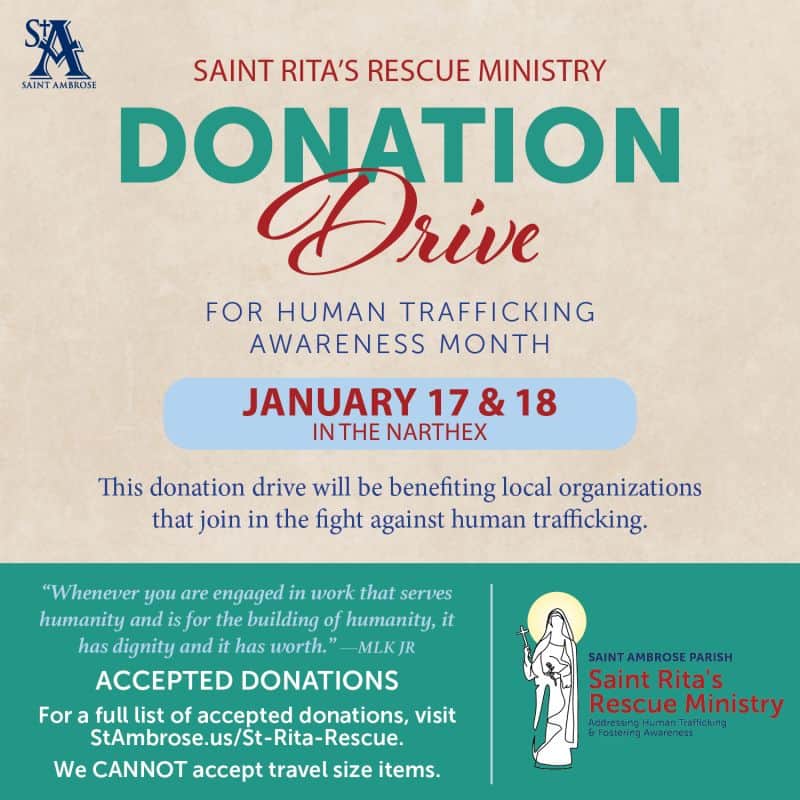 Saint Rita Rescue Ministry Weekend Donation Drive The month of January is Human Trafficking Awareness month and next weekend our Saint Rita Rescue Ministry will be hosting a small donation drive benefiting local organizations that they have partnered with that fight against this modern-day form of human slavery. Donations can be dropped off in the [...]